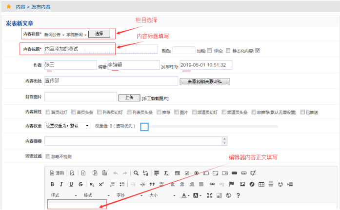 A:先發布一篇: “內容欄目”選擇、內容標題填寫、編輯器里面正文填寫;這三個字段必填即可發布內容。